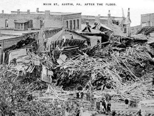 At some point between approximately 2:00 and 2:15 pm on September 30, 1911, the Austin Dam suffered a sudden and devastating collapse. No mill workers were present at the dam at the time of the collapse, and it was only witnessed by a few residents living near the dam and two people passing by in a car. The downstream towns of Austin and Costello were effectively destroyed by the wave of water released. 78 people lost their lives as a result of the disaster. Damages were estimated to be between $3-6 million (~$70-140 million in 2010).