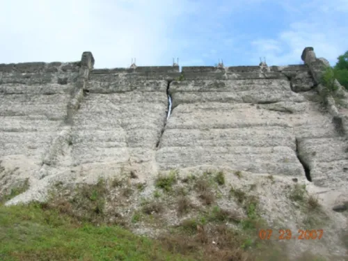 The next day, the dam slid downstream on its foundation, deflecting 18 inches at the toe and 31 inches at the crest and cracking in several places. T. Chalkley Hatton noted, “These cracks divided the dam into five or six distinct and separate sections.” Though divided, the dam remained anchored to the foundation rock. However, the foundation was poor and the rock layers slid over each other. All of this occurred in a span of about eight hours and a notch was blasted in the crest and the outlet pipe cap was blown off using dynamite in order to lower the reservoir level.
