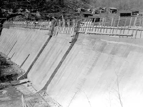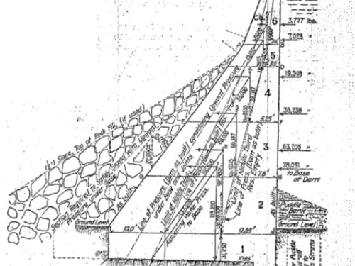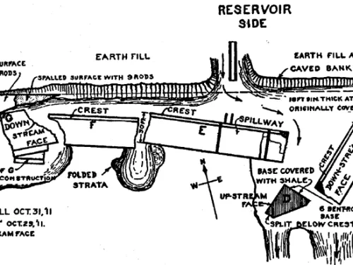 “The failure of the dam to withstand the flood of Jan. 21 is probably due to two causes. One of these is that the great bulk of concrete which had been hurriedly built, some during freezing weather, and which had been completed but six weeks before the maximum pressure came upon it, had not set up so as to attain its ultimate tensile strength. The most important cause, however, was due to the water getting under the dam. This condition was not anticipated when building the dam, and all precautions which seemed to be necessary at the time were taken to guard against it”. -T. Chalkley Hatton, 1910