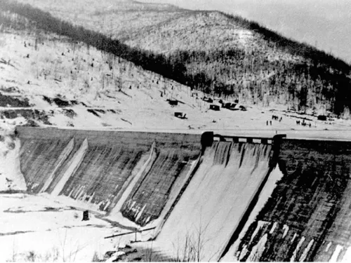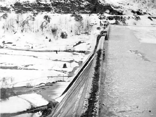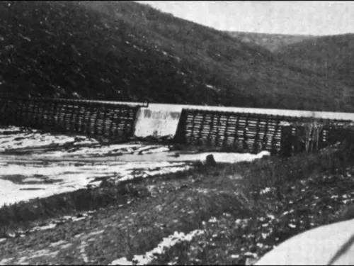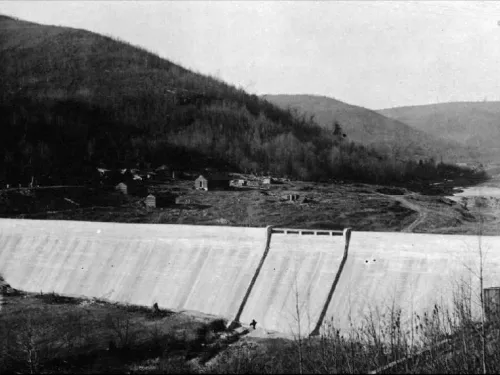 By December 1, 1909, the dam was ready to be filled. In mid-January, 1910, a warm period combined with rain caused a snowmelt that filled the reservoir behind Austin Dam within three days and the activation of the spillway for the first time. Shortly after, on January 22nd, a large slough occurred at the left abutment of the dam on the downstream side. Seepage flow was also detected along the toe of the dam and within the slide.