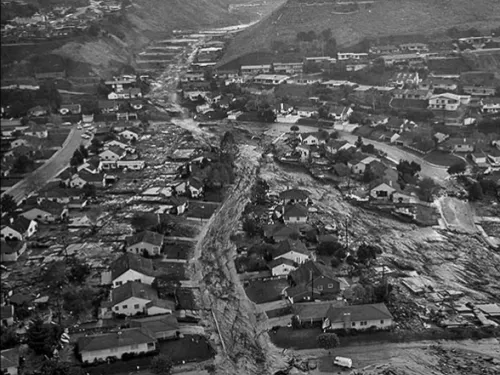 In the meantime, LADWP personnel worked furiously to clear debris from the emergency discharge pipes and stop the interior face of the dam from eroding. Despite their efforts, a section of the Baldwin Hills Dam collapsed at 3:38 P.M. unleashing a wave of destruction on the town below.