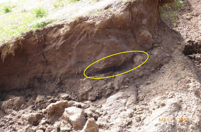 DSO observed buried organic material and sloping contacts between fill lifts, likely at the contact between the original dam and 2006-2007 dam raise, and “tube-like” features on the margins of the breach. There was no evidence of benching or filters. Although not noted by DSO, Exponent observed a considerable number of burrow holes on the upstream slope four years later. However, these bores existed below the normal pool elevation and were likely created after the breach.