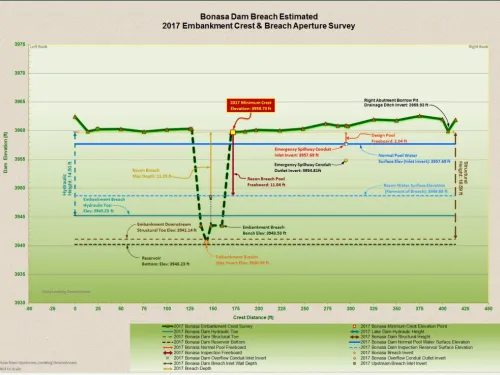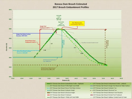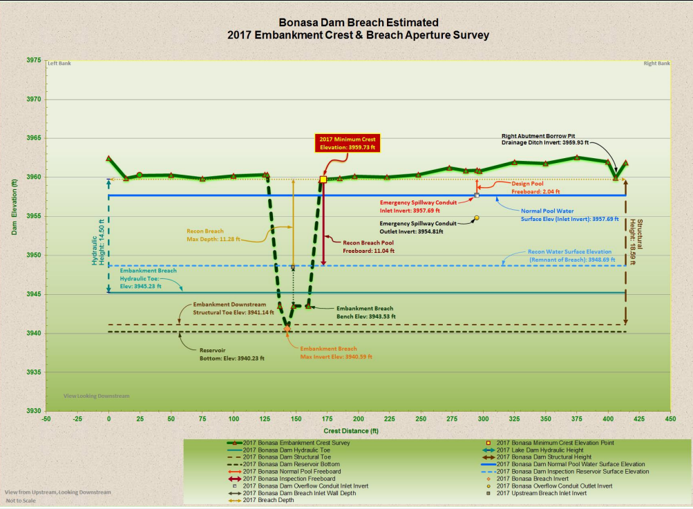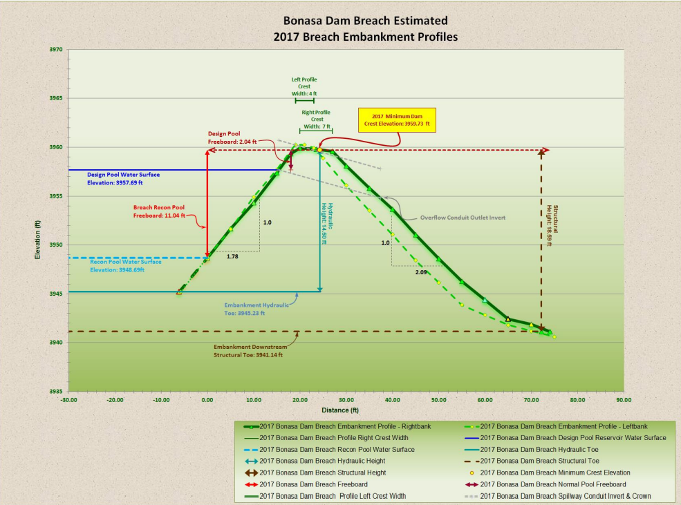 The breach was U-shaped and located approximately 125 feet from the north abutment. The breach in the embankment was 43 feet across at the crest and 23 feet across the bottom and had a maximum depth of 20 feet. The base of the breach exposed bedrock. DSO estimated the peak breach outflow to be approximately 2,500 cubic feet per second.