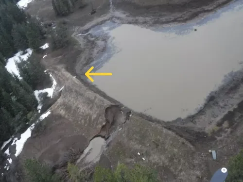 A high water mark was surveyed by DSO at 0.72 feet below the lowest measured (remnant) crest elevation at the margin of the breach. Given the narrow width of the breach and height of the embankment, it is unlikely that the dam overtopped. DSO also observed matting of the vegetation on the downstream slope. However, the area had recently experienced rapid snowmelt which could have caused this feature. There were no signs of erosion rills or gullies in the embankment slope or groins. Furthermore, vegetation was matted (from snow) in other areas outside the influence of reservoir water.