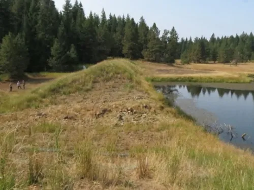 The earthen dam, originally used to form a stock pond, existed as early as the 1960s. The dam is generally aligned in a NNE-SSW direction with the reservoir on the western side. Based on air photos, the original surface area of the reservoir was estimated to be approximately 1.2 acres. The height of the original dam was unknown but the reservoir volume was estimated to be 10 acre-feet or less. It was reported that an emergency overflow section was located in the right abutment.