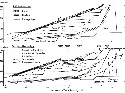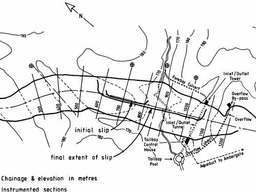 Design of the new Carsington Dam began almost as soon as the forensic investigators released their findings. The new design team added several features to the rebuilt dam to ensure its success. The new, more geotechnically rigorous design utilized more conservative material parameters that reflected an improved understanding of progressive failures. The designers eliminated the core boot and limestone drainage blankets, instead opting for a downstream filter drain. They significantly reduced the embankment’s slopes from 3:1 (H:V) to 3.5:1 along its upstream face and from 2.5:1 to 3:1 along its downstream face and added berm-like steps along both faces for additional stability. The designers also used FEM analyses to confirm the new design’s robustness. During construction, the designers and contractors used an extensive instrumentation program to check that observed and predicted soil behavior were congruent, as they proved to be. They also implemented strict protocols to prevent machine-induced rutting shear surfaces in the clay core, such as forbidding construction equipment from driving across completed fill areas before subsequent fill layers were placed. The job was further complicated by the need to remove over 2.6 million CY of failed material from the original dam during construction of the new dam. Despite these constraints, the contractors completed the new Carsington Dam in October 1991, 12 months ahead of schedule. It has performed satisfactorily ever since [2, 4, 7, 9].