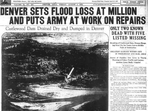 Hugh Pain, the dam tender, lived at the site with his wife and heard the roar of water going over the dam. He was the only known witness to the failure event. After first unsuccessfully trying to phone, Paine drove 12 miles to call the Denver Police and the local telephone operator. This would prove to be a key factor to saving lives during the flood. The warning was sent out over telephone line and radio. The telephone operator on duty that night was Nettie Driskill. Later regarded as a hero, Nettie called residents along Cherry Creek, issuing a detailed and concise warning, telling them to “hurry to higher ground.” It is estimated that around 5,000 people fled the lowlands in time to avoid the deadly rush of water.