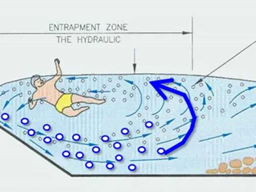 A common characteristic of low-head run-of-the-river dams, such as Dock Street Dam, is that they are typically less than fifteen feet high, have continuous overflow, and the overflow can create a transient hazardous hydraulic condition known as a submerged hydraulic jump or roller that exhibits a strong recirculating current that can trap and drown victims. As the water plunges over the dam, it entrains air causing boils that reduce the density of the water and the buoyancy of floating objects, including boats and persons wearing life jackets. Due to their reduced buoyancy, a person or a boat that becomes trapped in this zone can sink and/or capsize from the strong recirculating currents. The strong recirculating currents within this zone push victims to the bottom and downstream where the flow is less aerated. Victims then float to the top and are returned to the face of the dam by the top current where the cycle is repeated. The flow velocities and forces of the water currents at the downstream side of a low-head dam are usually too large for even experienced swimmers to escape. First responders and bystanders unaware of the hazards often become victims while trying to rescue others that have become trapped. This has occurred at least one time at Dock Street Dam when on June 24, 1960, a first responder drowned while attempting to recover a drowning victim.
