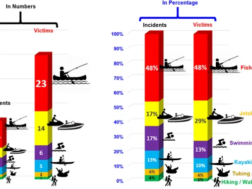 Based on the available incident data between the years 1935 and 2018, approximately 80% of the incidents and 80% of the fatalities occurred during a watercraft-related activity (fishing from a boat, power boating, kayak, floating, jetski, etc.). A common report among rescued victims was that they were unaware of the surface current immediately downstream of the dam that carried their watercraft upstream towards the dam into the hazardous recirculating current.
