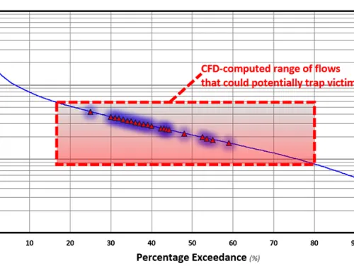 Analysis of river flow on the dates of each incident appears to indicate that the hazardous transient hydraulic condition at the dam occurs during flows between 8,000 and 60,000 cfs. These flows agree with detailed computational fluid dynamic modeling performed by the author for this site. Below 8,000 cfs, the hydraulic jump appears to be fully developed and swept downstream. Above 60,000 cfs, the dam is submerged and the upstream surface current appears to be eliminated. Hazardous conditions at the dam occur primarily when flows are between the 8,000 cfs and 60,000 cfs thresholds. Comparing this information with a plot of the percent of time the river flows are equaled or exceeded indicates that this hazardous transient condition exists at the Dock Street Dam approximately 70% of the time.