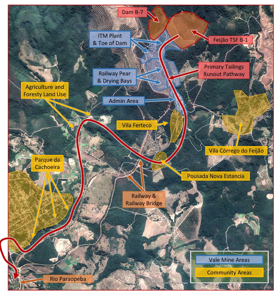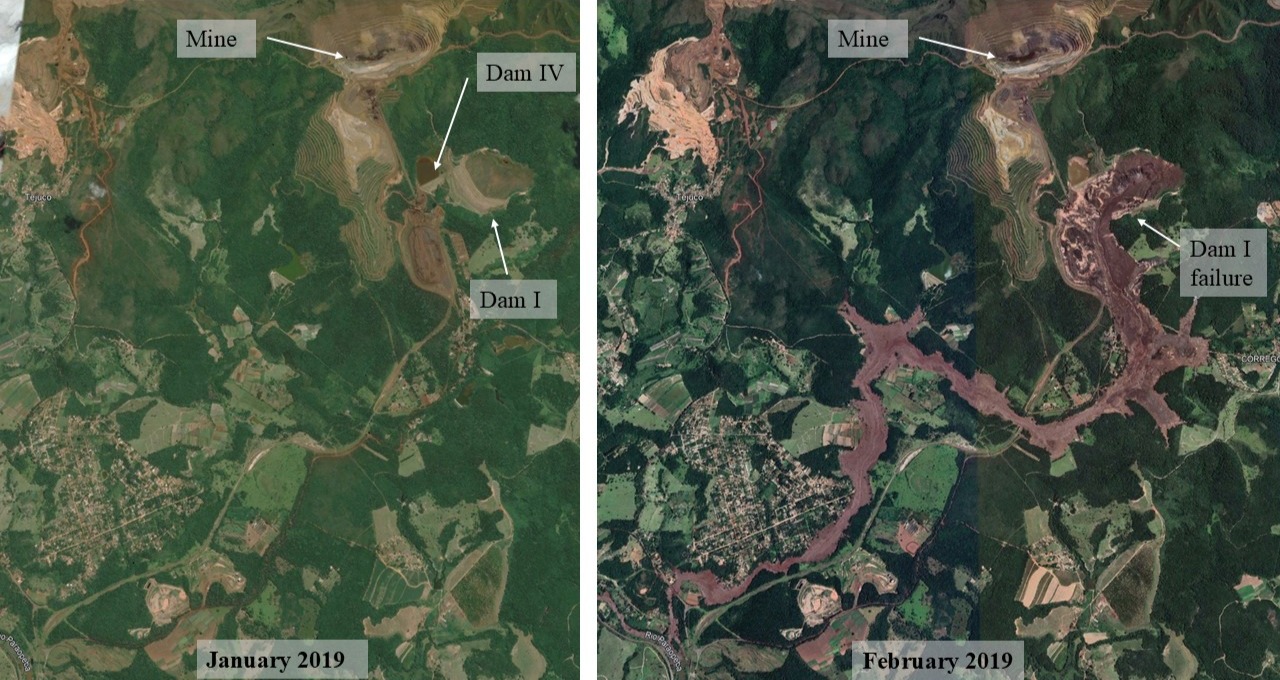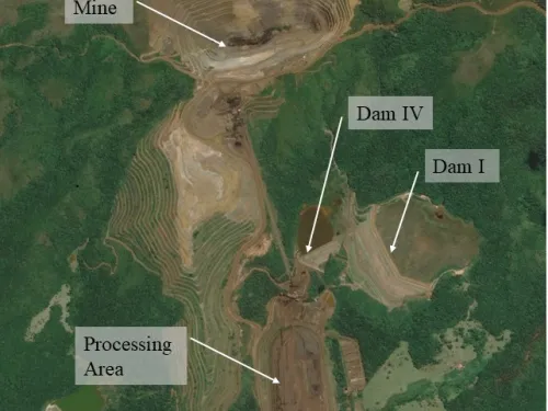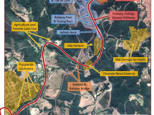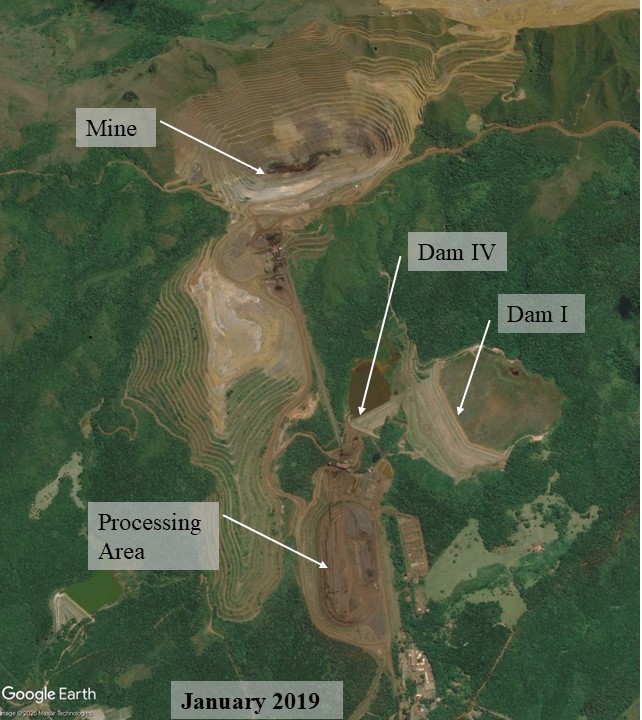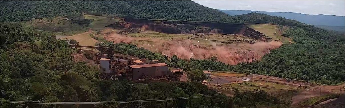 At 12:28pm on January 25, 2019, Dam B-1 failed catastrophically, killing 272 people and causing extreme environmental damage in the Paraopeba River watershed. When the dam failed, 9.7 million m3 of liquefied mining waste - 75% of what was stored - was suddenly released downstream, engulfing the mine’s railway, administration and maintenance area, including a canteen where miners were having lunch. The tailings progressed rapidly downstream destroying homes, farms, and roads. The mud covered an area equivalent to 450 football fields. The slurry traveled downstream to the town of Brumadinho, reaching speeds up to 120 km/hr, as it destroyed buildings and buried people caught in the runout zone. After flowing for more than 5 miles downstream, the mudflow reached Paraopeba River, causing significant harm to wildlife in its path.
