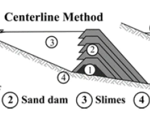 The material used to construct the dam was generally obtained from the tailings targeting the coarse-grained fraction of previously deposited tailings. The operation of the tailings disposal process was designed to result in the segregation of the coarse fraction from the fine-grained fraction using hydraulic settling. The sluiced tailings were discharged from the top of the dam crest onto the upstream side of the berm, with the intent of the coarse tailings fraction settling near the berm and the fine-grained fraction flowing with the sluice water to a lower elevation some distance from the berm.