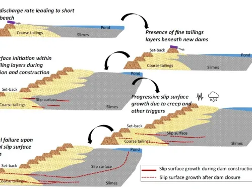 A recent study by Zhu et al3 in 2024 suggests that the trigger was delayed slip surface growth along weak layers, likely influenced by creep deformation. The fine tailings layers provided a point of initiation for slip surfaces to form and propagate progressively under the increasing weight of the dam during its construction and raisings. The length of the slip surface within the weaker fine layers was not enough to cause failure of the dam during and immediately after its construction. While the weight of the dam stopped increasing after the dam closure in 2016, the slip surfaces continued growing within the fine tailings layers under the constant external loads, driven by the creep deformations. This growth was very slow and unstable, and the slow process continued, until the length of the slip surface reached the critical value, triggering the classical catastrophic slip surface propagation and subsequent dam failure.