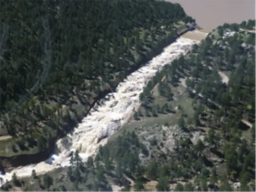 Around this time, a National Guard helicopter pilot flying missions to rescue stranded citizens noted significant flow over the emergency spillway for the Ralph Price Reservoir (also known as Button Rock Dam). This reservoir is located on North St. Vrain Creek that serves as a water source for the City of Longmont, CO. During the peak of the storm, approximately 10,000 cfs flowed through the emergency spillway and into the Town of Lyons, CO, causing devastating damage. There was no reliable information available to confirm the condition of the dam as road access was not possible and the dam’s caretaker was evacuated from the site in the midst of the storm. A helicopter flight was coordinated by the Emergency Operations Center to evaluate the condition of the dam and spillway. On Monday September 16th, representatives from FEMA, the City of Longmont, and the Colorado Dam Safety Branch were flown to the site to assess the condition. Based on review of the geology and spillway design drawings and visual examination of the concrete spillway structure and downstream rock channel from the air, it was determined the channel was well armored by bedrock and performing as designed. This helicopter reconnaissance mission and many more like it to other inaccessible areas along the Front Range were invaluable in rapidly investigating conditions, and informing emergency managers and the public.