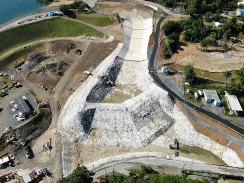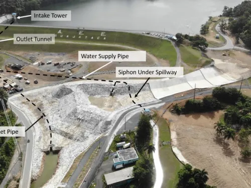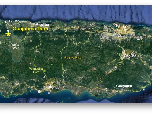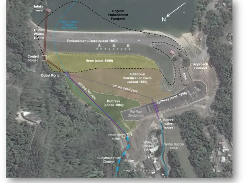 Guajataca Dam is a 121 foot high, 1,037 foot long, high hazard potential earthen embankment structure constructed using semi-hydraulic fill methods for the central core (i.e., puddle core) and rolled and compacted outer shells composed of a mixture of clayey soils, gravel, and cobbles. The facility has a low-level outlet works control structure and conduit through a right abutment tunnel; an uncontrolled semicircular concrete weir spillway with an approximately 700 foot long trapezoidal-shaped concrete chute discharging back into the Rio Guajataca; and a 54-inch diameter water supply line that empties into an open channel canal after flowing through a siphon buried under the spillway.