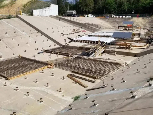 The spillway is aligned sub-parallel to the direction of movement of the landslide mass, and it discharges orthogonally back into the river, forcing spillway flows to make a nearly 90-degree turn at the bottom of the chute. The chute included 18-inch-high steps (i.e., drops) between the articulating chute slabs (intended to accommodate shifting due to continued landslide creep). The only energy dissipation was placement of rip rap at the lower portion of the spillway chute and no baffle blocks or stilling basin were included in the re-construction. Beyond the end of the spillway the in-situ foundation materials at the downstream end of the chute and riprap had limited erosion or scour protection and the materials were found to be composed of previously disturbed and weakened landslide materials. Following the 1980’s reconstruction continued foundation re-adjustments and displacement related to the creeping landslide movements manifest as cracking, settlement, and distortion of the spillway slabs and walls. During this deformation, binding of the articulated spillway slabs caused increased stress and significant cracking, wall rotation, and formation of foundation voids over the past 40 years of service. During this time, it’s considered likely that precipitation and subsequent spillway flow events infiltrated through the cracks and potentially caused erosion and deterioration of the underlying foundation materials and/or plugged or damaged the underdrain system.