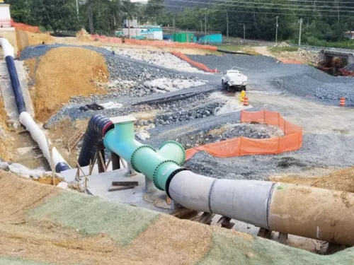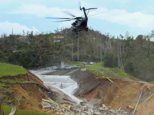The USACE emergency assessment engineers were onsite September 24, 2017, just a few days after the landfall of the hurricane while water was still flowing over the spillway to assess the condition of the dam and develop an emergency response to prevent progressive erosion of the entire spillway, stabilize the embankment, protect the integrity of the dam, and identify potential alternatives for Interim Risk Reduction Measures (IRRM). Given the difficult access to the dam (i.e., narrow winding roads clogged with fallen debris and landslides that limited heavy vehicle access); its remoteness; the 1,200 miles separating the island from the US mainland and related supply chain issues; and the lack of power and fuel to transport and place erosion control materials such as riprap, armor stone, or concrete, the team determined the only locally available and transportable materials consisted of concrete Jersey barriers identified in storage yards within the northwest portion of the island. US Navy and Marine helicopters dropped over 500 of these barriers at the edge of the failed portion of the spillway within the scour hole to protect it against further erosion. A short distance downstream and within the scour area, an 8 foot tall line of approximately 1,340 gravel-filled sacks were placed by US Army helicopters to create a temporary stilling basin to raise tailwater in the scour hole and further decrease erosive flow velocities if the reservoir rose again over the spillway crest. In addition, ten 18-inch diameter pumps with generators connected to HDPE bypass pipelines were procured from the US mainland to re-establish the water supply to the canal and to maintain the reservoir elevation below the spillway along with clearing debris from the low-level outlet structure, which discharged downstream of the scour hole.