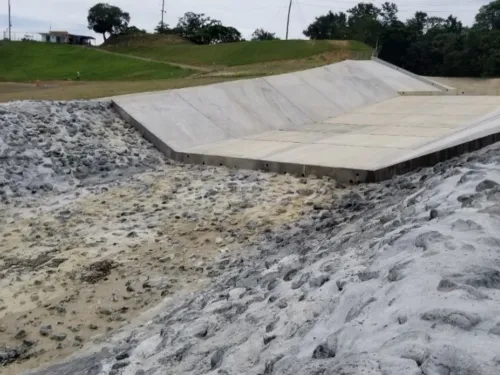 - Flow-able fill placed below the undermined and failed slab and encompassing collapsed portions of spillway slab, Jersey barriers, and additional riprap stone placed under the Vol. 1 efforts.