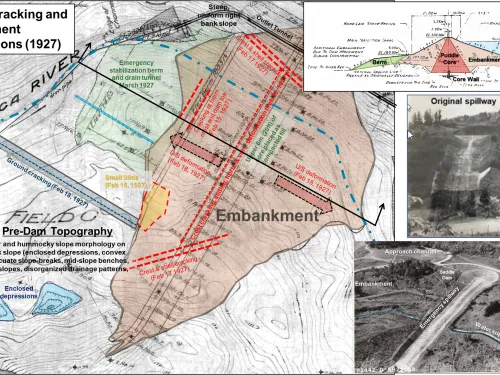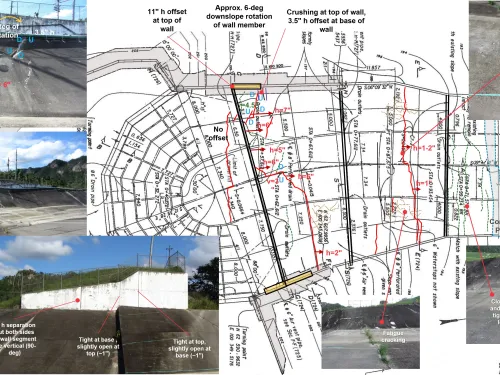 The spillway and majority of the dam foundation that are positioned on the left side of the Rio Guajataca and are founded on a large (0.25-0.5 mile wide by 2 miles long), deep-seated, and actively deforming translational landslide complex, which in conjunction with the semi-hydraulic core fill construction method, contributed to significant deformations of the embankment and surficial ground cracking that occurred during initial construction (1927). Over the following decades the landslide and project structures to the left of the river continued to creep and shift resulting in significant cracking and deformation (e.g., settlement, lateral movement, rotation, etc.) within the spillway monoliths, chute slabs, training walls, and within the embankment itself.