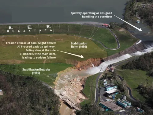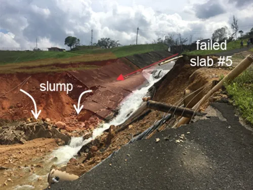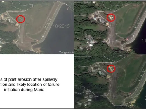 Puerto Rico had experienced severe drought conditions just a few years earlier, which reportedly led to a decision to keep the reservoir level near the spillway crest following Irma. Maria’s rainfall resulted in overtopping of the spillway weir crest by approximately 3.25 to 6.5 feet, resulting in spillway flows of up to an estimated 10,000 to 15,000 cfs. The spillway had experienced six previous flow events over its lifetime without reported incident; however, review of historic aerials shows evidence of past erosion off the side of the spillway. Ultimately, the Hurricane Maria induced flows exacerbated foundation erosion and caused failure of about 50% of the lower concrete spillway chute as well as inducing lateral erosion into the stabilization berm and buttress designed to reduce the potential for embankment and landslide acceleration.