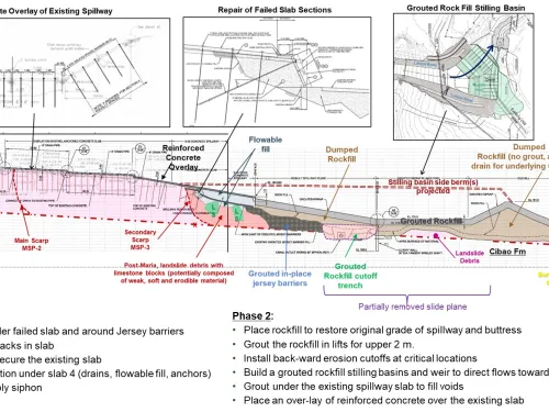 Following initial stabilization of the spillway, USACE was tasked with evaluating and developing IRRM alternatives to bring the spillway back into service (i.e., pass a similar scale Hurricane Maria hydrologic event without failure). This effort included hydrological, hydraulic, structural, and geotechnical engineering assessments to support multiple phases of risk assessments that would help inform the relative value of the selected IRRM. These studies included field investigations (i.e., geotechnical drilling, sampling, and testing; evaluation of existing site geotechnical and instrumentation data; and detailed engineering geologic mapping) that were all compiled to define the failure mechanics, geometry, and characteristics of the landslide complex.