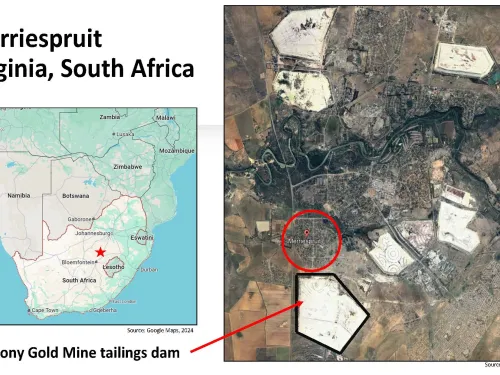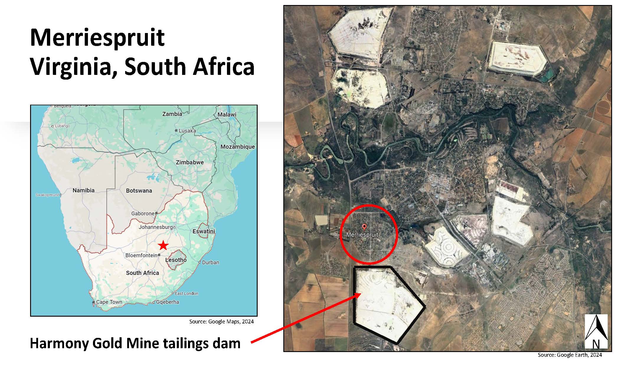 Merriespruit is a community in the township of Virginia in the Free State Goldfields of South Africa. It is located in the Witwatersrand Sedimentary Basin which contains the world’s largest accumulation of gold. In South Africa, the mining sector is the single largest generator and accumulator of solid waste. The township of Virginia was developed in 1936 with the discovery of the Free State Goldfields. The 250-home community of Merriespruit was built near the Harmony Gold Mine in 1956 to provide housing for mine personnel. When the construction of the Harmony Gold Mine No. 4 Tailings Dam began in 1978, just 300 m (1,000 feet) away from Merriespruit, the community already existed for over two decades.
