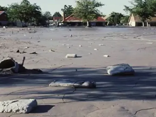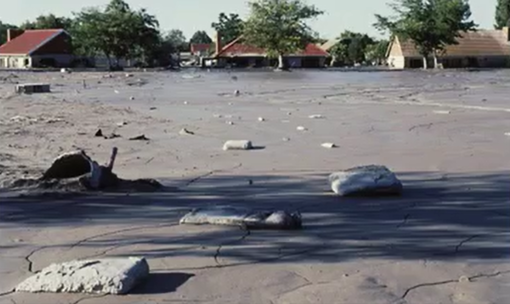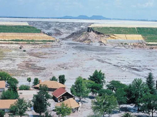 From October 1993 to early 1994, the summer in Free State was particularly wet. On Tuesday, February 22, 1994, a storm produced approximately 32 mm (1.26 inches) of total precipitation. According to Strydom and Williams [9], “The most intense precipitation was about 20 mm (0.79 inches) in a period of about 20 minutes after 18:00 and this would be an event with a five-year recurrence interval, which is nothing out of the ordinary”. Eyewitnesses reported seeing water flowing over the top of the crest of the northern wall of the dam in the evening of February 22 at about 7 p.m., two hours before the failure. At 9 p.m. that night, a sudden failure of the dam at the northern wall occurred, and a 450-foot wide breach formed, releasing about 630,000 m3 (500 acre-feet) of tailings slurry through Merriespruit. The flood wave was 2.5 m (8 feet) high when it hit the first homes in the town, knocking some of them off their foundations. Since the failure occurred at 9 p.m., some people were already in bed when the failure occurred and found themselves suddenly floating in their beds against the ceiling; others were blinded by the contaminated mud.