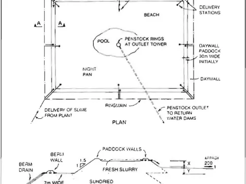 South African gold tailings impoundments are typically designed and operated as perimeter ring dikes with the tailings embankment raised using a variant of the upstream method with a “daywall-nightpan paddock” system. The outer perimeter of the tailings dam is referred to as the “daywall.” The daywall is raised to provide freeboard and to allow for maximum time for evaporation and desiccation, which is usually around three weeks on average. As a level of the daywall paddock embankment becomes sufficiently dry, the next level of paddock wall is built up in order to receive the next batch of tailings. The rate of rise is typically 1 to 3 meters (3 to 10 feet) per year. These operations are conducted under supervision during the day, hence the name daywall. Discharge of tailings can also occur overnight without supervision; into an area often referred to as the “nightpan.” Tailings discharged into the nightpan make their way towards a penstock outlet tower, which is normally located in the center of the nightpan area of the dam and is used to decant, or gradually drain water, without disturbing the tailings sediment.