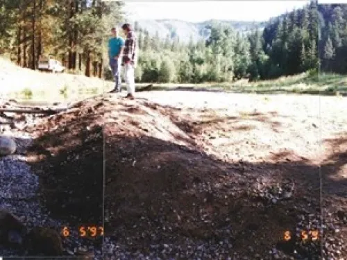 Hawkins Dam impounds Wenner Lake No. 1, the most downstream reservoir in the Wenner Lakes chain of manmade lakes located 6 miles Southeast of Twisp, WA in Okanogan County. The dam is a 35-foot high earthfill dam with a crest length of 350 feet and impounds a 4-acre reservoir with a volume of 22 acre-feet. It was rated as a significant hazard project because of two residences and a state highway located downstream. The principal spillway was a drop-inlet that consisted of a 12-inch diameter riser pipe with a 15-inch diameter outlet pipe. An unlined, two-stage open channel emergency spillway was excavated through the right abutment. This spillway had a pilot channel with a 30-foot width and an invert elevation 4.3 feet below the dam crest. A fuse plug section was provided between the right end of the dam and the pilot channel, with a top width of 60 feet and a top elevation 3.3 feet below the dam crest. The fuse plug section had a buried concrete erosion cutoff wall at the entrance to prevent erosion into the reservoir. This cutoff wall did not extend across the pilot channel. The spillway channel downstream was founded in native soils and was unlined.