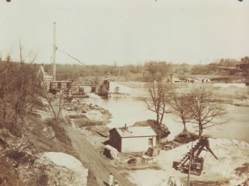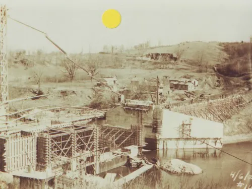 Lake Delhi Dam was originally constructed by the Interstate Power Company between 1922 and 1929 for hydroelectric power generation. The dam was located in Iowa approximately 1.4 miles south of Delhi on the Maquoketa River and impounds the nine-mile-long Lake Delhi. Reaching a maximum height of 59 feet, the dam consisted of four sections as follows (from left abutment to right, looking downstream): a 60-foot long concrete-armored earthen embankment, a 61-foot long reinforced concrete powerhouse, an 86-foot long concrete ogee spillway with three control gates, and a 495-foot long earth embankment section with a concrete core wall.