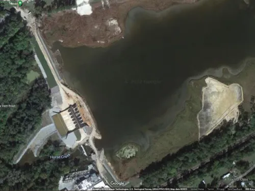 As happened twice in 1886, the South Carolina Railroad was swept away near where the pond discharge meets Horse Creek.
