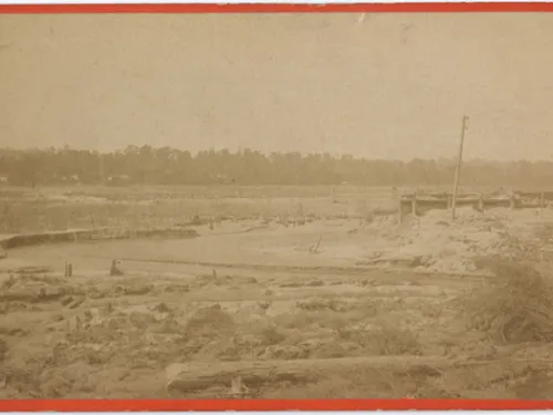 A major blow to completing the dam occurred on August 16, 1867, when a historic flood on Horse Creek failed dams upstream of Kalmia Mills that in turn caused Kalmia Mills Dam (which was still construction idled) to partially fail and the next dam downstream, Bath Paper Mills Dam, to fail. Subsequently, in December 1867, Francis Murry, contractor for dam construction, sued Kalmia Mills for $20,000 to recover losses he had from non-payment of money owed him for construction services. Six months later, Murry’s estate, which may have included land for the dam’s borrow source, was in bankruptcy.