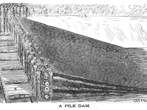 In July 1871, Langley Dam was described as being about 400 yards long, 80 feet at the base and 18 feet wide at the crest. A later description of the dam from Water-Power of the United States (U.S. Census Office, 1880) stated that the Langley Dam construction type was earth and crib-work, it was 1,000 feet long and 24 feet high ponding water of over 700 acres to a depth of 10 feet. A newspaper report published in 1866, several years before the dam was completed, showed the dam averaged 180 feet at the base, was 27 feet high, had a crest width of 18 feet, 5 feet of freeboard and embankment slopes of 3H:1V. It is not clear if these discrepancies in the shape and size of Langley Dam were due to inaccurate reporting or to the fact that construction (and re-construction) of the dam took place over a 14 year period that may have included actual changes to the dimensions. Based on the available nearby borrow sources and one reference to transport of material from the west (right) side of the dam, the embankment material was likely derived from Cretaceous age deposits which consisted of sand with minor amounts of clay. It is also quite possible that some Holocene age alluvial floodplain deposits were used in construction of the dam. The method of placement is unknown, but it appears safe to say that based on recent soil investigations at the site, there was little if any compaction. It is obvious that the design and construction practices employed in the building of Langley dam did not meet modern day criteria; however, beyond the information given above, details of the design and construction are not known.