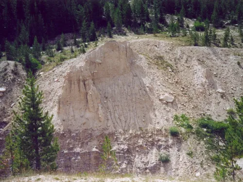 Little Deer Creek Dam and Reservoir were conceived as part of the Kamas Water Project and were owned by the South Kamas – Washington Irrigation Company. The dam was designed by the Utah Water and Power Board who also oversaw construction. The dam had a height of 75 feet with a 20-foot-wide crest, a 2H:1V downstream slope, and a 2.5H:1V upstream slope. The dam embankment was designed as zoned earth fill with pervious and impervious zones and a rock toe drain. Eighteen-inch reinforced concrete pipe made up the low-level outlet, and a 12-foot-wide channel with 1.5H:1V side slopes excavated through bedrock on the left abutment served as the spillway. An upstream guard gate regulated flows through the low-level outlet. The reservoir was designed to hold 1,450 acre-feet of water with a 31-acre surface area at the spillway crest. A concrete reservoir gage, still visible today, was constructed upstream of the left abutment. Three borings and three test pits comprised the geotechnical investigation for the dam. A cutoff trench that was 20 feet wide and 6 feet deep upstream of the dam centerline was included in the design.