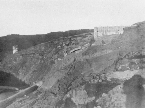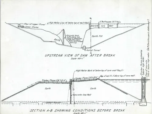 On the morning of June 24, 1917, the dam watchman reported the reservoir level was holding steady or perhaps even falling slightly. With no reports of flooding and no observation of anything unusual, he retired at 11:00 A.M. to the bunkhouse, about 1,000 feet away, for lunch. When he returned the scene had changed dramatically.