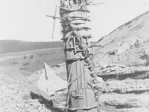 By the fall of 1916, construction of the core wall and upstream shell had reached a height of 67 feet. The downstream shell was 5 feet below this elevation. The crest of the dam measured 160 feet wide. Thirsty for water and with 58 feet of dam still to build, the Price River Irrigation Company made the decision to store water in the reservoir during the fall and spring of 1916-17. In anticipation of using the reservoir, 5 feet of additional core wall was placed in late fall of 1916 bringing it to a height of 72 feet. A 7 foot high earthen embankment was constructed at the upstream shoulder of the crest to provide additional storage with a 10 foot wide, 2.5 foot deep wooden flume erected to convey overflow across the crest of the dam to the right abutment and back to the stream channel. Because of the differences in elevation of the upstream and downstream shells, flow through the upper flume would drop 5 to 7 feet after passing through a rectangular notch in the core wall to a lower section of the flume. Of note is that the intake tower had only reached a height of 68 or 69 feet. To store as much water as possible, form boards were left in place providing a coffer dam around the top of the tower. As the reservoir filled, boards were nailed to the flume intake to form an 18-inch tall bulkhead. By June 24th of 1917 the reservoir level was 4 inches below the top of the wooden bulkhead.