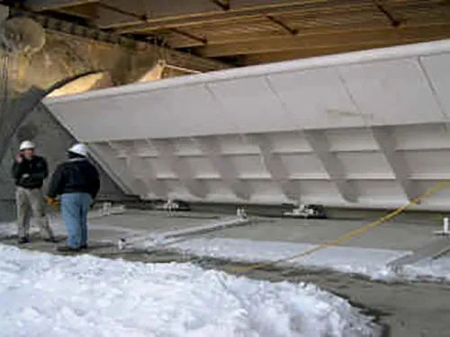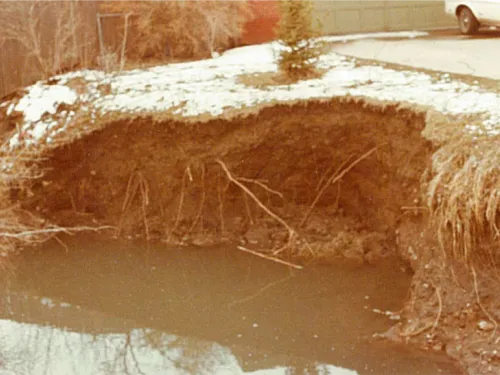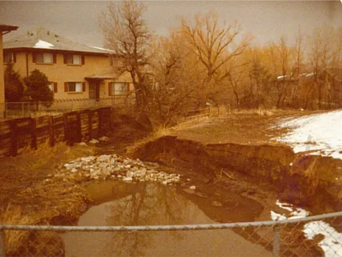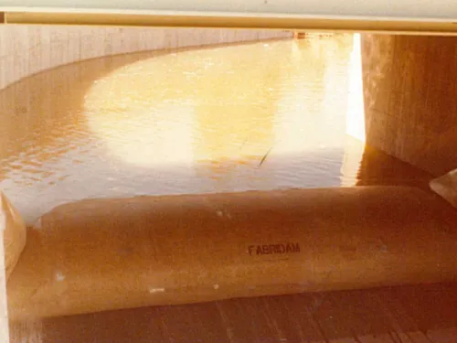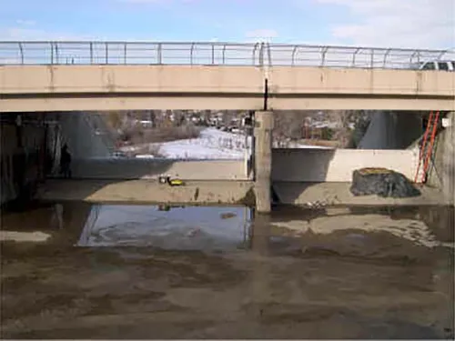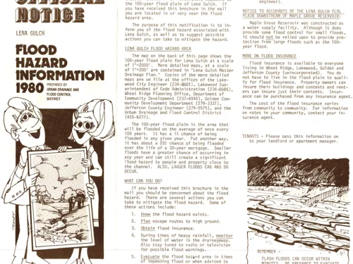 In 1975, the Urban Drainage and Flood Control District (UDFCD) recognized the unintentional flood attenuation benefits created by Maple Grove Dam for portions of Wheat Ridge, Jefferson County, and Lakewood. These municipal communities along with the CMWC and the UDFCD collaborated in 1976 to design a unique spillway enlargement that would meet the needs of both the CMWC and the flood-prone communities downstream of the reservoir. This new design included the addition of two Fabridams, one 30 foot long by 6 foot diameter and one 40 foot long by 10 foot diameter, placed within the newly enlarged spillway beneath the W. 27th Avenue bridge. The Fabridams were able to be filled with either water, air, or a combination of both and included automatic controls for ease of maintaining desired heights of both dams. The resulting design provided the UDFCD and downstream local governments with greater flood attenuation during 1x10-2 AEP (1 in 100 chance) storm events while giving the CMWC confidence the reservoir would be able to withstand the SPF without overtopping. The design was approved by the Colorado DNR State Engineer’s Office and construction of the spillway with the additions of the Fabridams was completed in August of 1977.