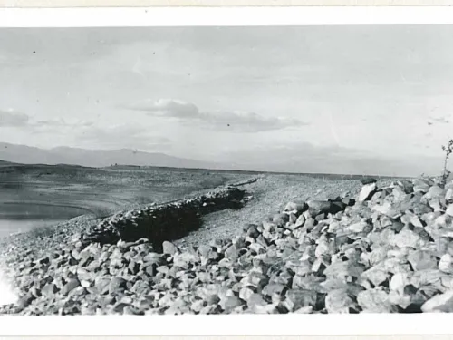 A fourth downstream slope failure developed in 1946 in the same location as the 1942 slope failure. This slope failure was notably less significant than the previous failure in this location, dropping the dam crest by 2 feet in a 200-foot-wide reach, but was sufficient to prompt extension of the 1922 stability berm to the south of the outlet works alignment. This slope failure was initially attributed to “the solutioning of soluble salts in the embankment,” and later to a leaky outlet pipe.