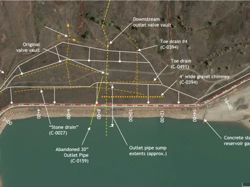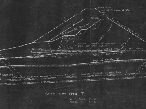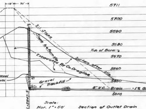 Shortly following the first reservoir fill in 1910, a rotational failure of the downstream slope developed, extending through the dam crest to the upstream slope. The reservoir level at the time of the failure was not documented; however, the slope failure did not lead to an uncontrolled loss of the reservoir contents. The caretaker was able to drain the reservoir despite severe damage to the 30-inch diameter CMP outlet pipe. The dam was rebuilt in 1910 with a slightly flatter (3H:1V) downstream slope and a new 48-inch-diameter inverted siphon outlet works that tunneled through the Laramie Formation claystone foundation approximately 20 feet below the presumed bedrock surface. The upstream two-thirds of the original 30-inch outlet pipe was abandoned in-place with only a minor cap on the upstream end.