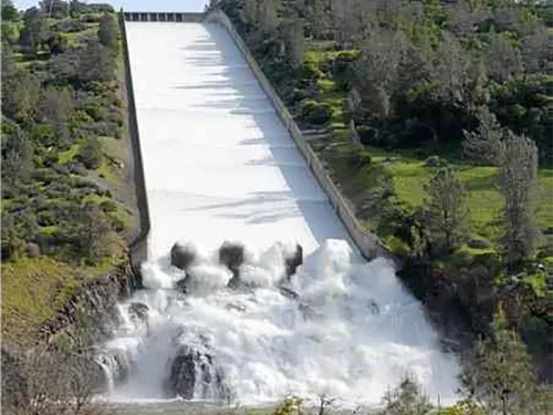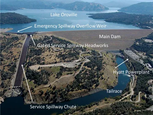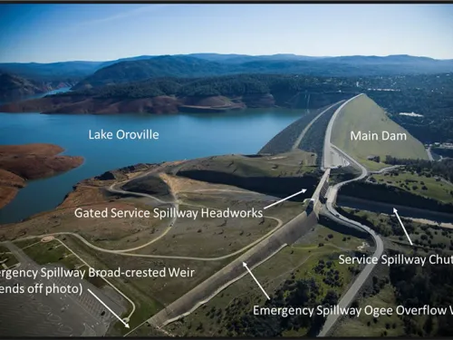 With a height of 770 feet, Oroville Dam is the tallest dam in the United States. Completed in 1968 and located north of Sacramento in the foothills of the Sierra Nevada mountains, this large earthfill embankment dam is owned by the California Department of Water Resources (DWR) and is one of the key features of the California State Water Project, which supplies water to more than 23 million people throughout California and is the largest state-owned water storage and delivery system in the United States. To convey water past the dam, the dam has two spillways on its right abutment. The service spillway consists of a concrete chute which is over 3,000 feet long and 179 feet wide, dropping about 500 feet to the river below, and controlled by eight steel radial gates at its headworks structure. The adjacent unlined emergency spillway has two sections at its crest: a concrete ogee weir which is up to about 50 feet high, adjacent to a broad-crested weir section. Below these crest sections, emergency overflow runs down the hillside over natural terrain to the river below.