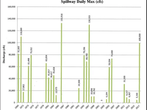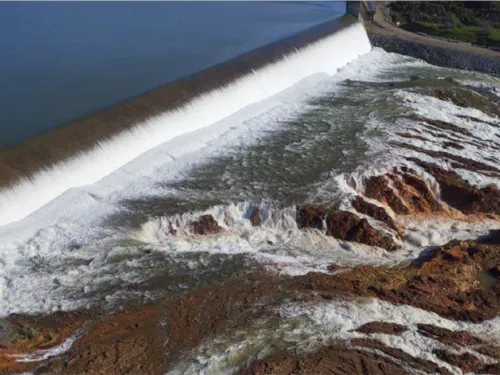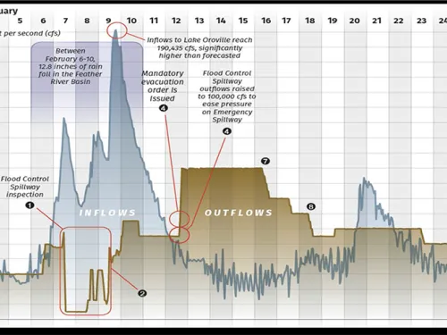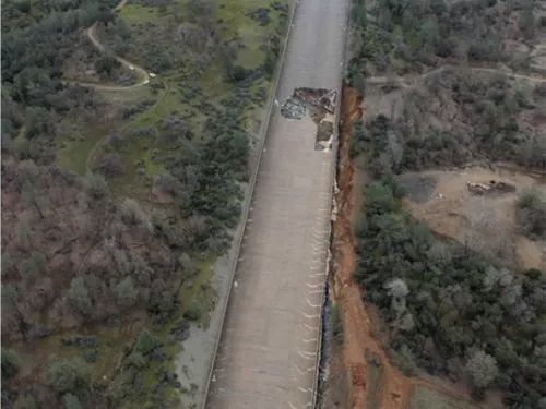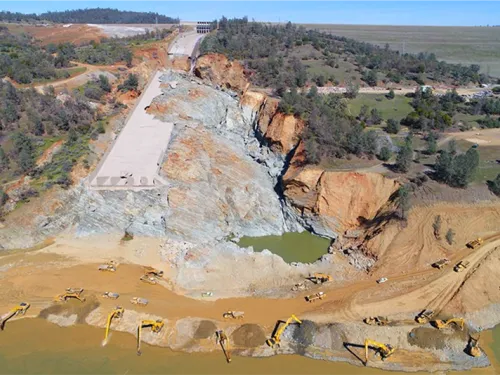 As documented in extensive media coverage, on February 7, 2017, while the service spillway flow was about 52,500 cfs (much less than the historical maximum of 160,000 cfs about a decade prior), the service spillway chute suddenly experienced failure and removal of a section of the concrete slab about halfway down the chute. This was immediately followed by rapid erosion of the foundation and adjacent ground, and progressive failure and removal of the chute slab in the upstream and downstream directions. In an effort to monitor and control the damage to the chute while managing the reservoir level, adjustments were made to the chute flow, but major storms in the large watershed ultimately resulted in the reservoir rising until the crest of the emergency spillway was overtopped for the first time in its history, four days after the chute damage initiated. Despite the maximum flow at the emergency spillway reaching only about 12,500 cfs (less than 4% of its design capacity), staff of the owner and regulators were shocked to see that the hillside was eroding and headcutting rapidly due to the overflow, to the extent of posing a risk that the ogee weir structure at the crest of the emergency spillway could potentially be undermined and fail due to overturning or sliding instability, resulting in downstream flooding due to uncontrolled release of the reservoir. This risk prompted opening of the gates for the service spillway in order to increase the chute flow to about 100,000 cfs and lower the reservoir level, as well as evacuation of about 188,000 people. Due to the very large size of the dam and spillways, and the number of people at risk, this was one of the most serious dam safety incidents in United States history, and the estimated cost for the repairs and recovery was about $1.1 billion.