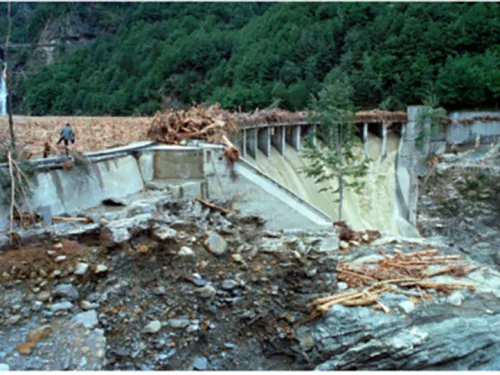 Upstream of the dam, large quantities of sediment and woody debris continued to flood into the reservoir. It is estimated that approximately 25,000 cubic meters of wooden debris and logs engulfed Palagnedra Lake, blocking the 13 spillway openings and causing complete overtopping of Palagnedra Dam. The upstream dam and diversion tunnel became inoperable due to approximately 1.8 million cubic meters of silt, sand, and gravel covering the diversion tunnel with a 12- to 14-meter-thick layer of sediment. The grating of the water intake was partially destroyed, blocking the 7.5 kilometer long and 3.75-meter diameter bypass tunnel for the hydroelectric plant. With all the methods for bypassing the flow inoperable, flow overtopping the right abutment quickly eroded away the earthen backfill exposing the concrete core and causing severe damage to the structure.