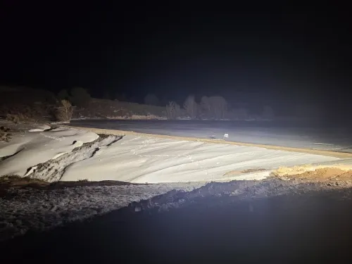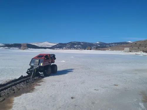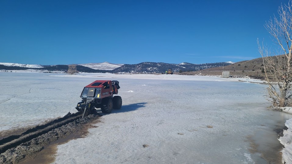 Reservoir ice continued to push against the upper portion of the dam, threatening to overturn the damaged section and release the upper portion of the reservoir. The owner of the dam was already cooperating with state dam safety officials to release water from the reservoir, working to lower the reservoir level below the damaged portion of the dam. Engineers placed an inclinometer, a device that measures angles, on the crest of the dam to monitor movement of the damaged section. County road construction crews brought in heavy equipment and access to a nearby rock quarry was provided. Crews began to place riprap along the downstream edge of the tilting, damaged section to stabilize it. Finally, to relieve pressure from the reservoir ice sheet pressing against the dam, a large, remotely controlled trenching machine was brought onsite and used to trench across the ice. Once the thickness of the ice was deemed sufficient to support the weight of the trenching machine, it was used to make several cuts across the ice near the dam. This created space for the ice to recede away from the dam. Focusing on these three efforts: lowering the reservoir, relieving ice pressure on the dam, and stabilizing the damaged area of the dam, responders were able to prevent the loss of the reservoir and any resultant downstream damage.