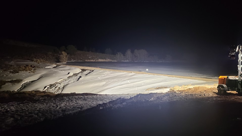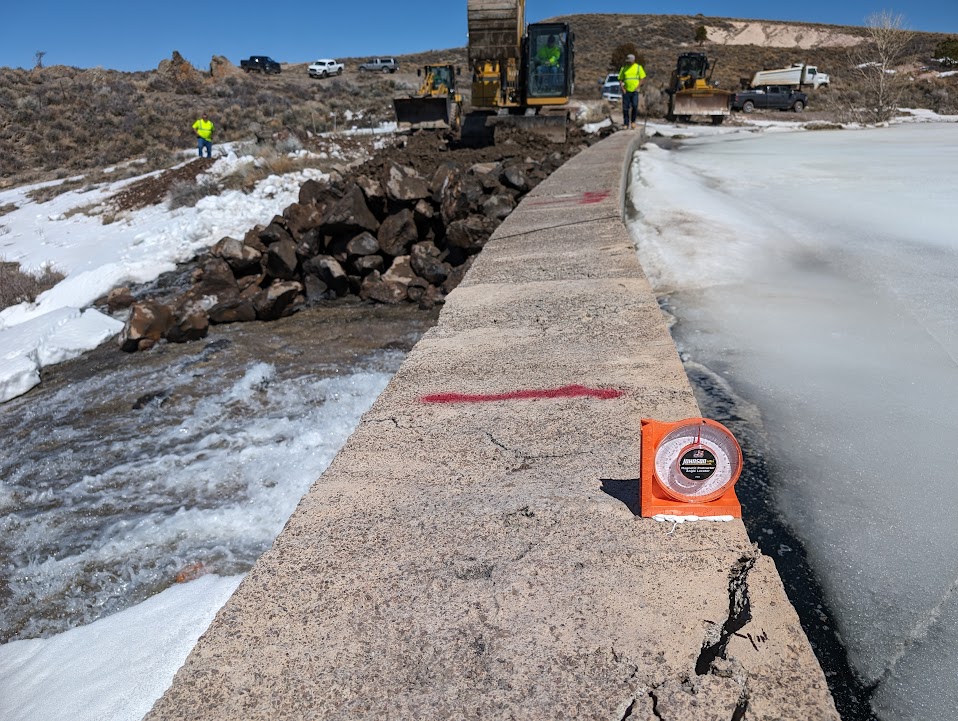 On April 8, 2024, the Utah Division of Water Rights, Dam Safety Section was alerted to an ongoing incident at Panguitch Lake Dam. The ice sheet on the reservoir was being pushed up against the dam and had created a 60 to 80-foot crack in the upper three to five feet of the dam, indicating this portion of the dam was not able to structurally resist the forces induced by the ice sheet. Reservoir water was flowing through the cracked upper portion of the dam and continued pressure from ice was pushing the damaged section over. Concern that the damaged portion of the dam would eventually fall over, leading to an uncontrolled release of the upper portion of the reservoir, led to the Garfield County Sheriff initiating the emergency action plan. The cooperative response from local, state, and federal officials; engineers; emergency responders; and the community demonstrated how effective an emergency action response can be. The county sheriff’s department closed the nearby rural highway preventing harm to motorists in the event of failure and providing unimpeded travel between the town of Panguitch and the dam site for response personnel. Onsite engineers assessed the cause of the incident and developed a three-pronged approach to mitigate a potential failure.