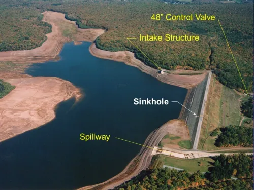 In July 1994, while the reservoir was filled to capacity, piezometric levels suddenly declined 10 to 20 feet in the vicinity of the original sinkhole location from 1960. At first, the drop was overlooked as it coincided with a planned reservoir drawdown, but eventually the changes in the piezometer levels were interpreted as a possible early warning sign of recurrence of piping. The seepage records showed that the total seepage increased to over 900 gpm which further indicated the dam was deteriorating.