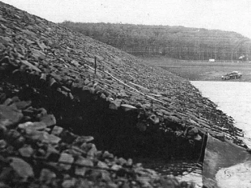 Almost immediately after its completion, the dam began experiencing problems. As the water rose within 4.5 feet of the spillway crest during the first filling in 1960, approximately 350 gallons per minute (gpm) of seepage began flowing from a road immediately downstream of the dam. Just one month later, a large sinkhole (15 feet in diameter and more than 15 feet deep) developed on the upstream slope of the dam. The water level in the reservoir was lowered immediately, and the sinkhole was repaired by backfilling with earth and rockfill and covered with concrete bags. Although the fill had very little effect on the leakage, the lowered reservoir level reduced seepage to about 90 gpm. Initial repairs consisted of grouting the underlying foundation rock in the vicinity of the sinkhole and pressure injecting surface-hydrated bentonite lumps and cellophane strips in the embankment to fill the voids. During drilling for grouting, voids were encountered in the embankment up to 18 inches in diameter. The grouting program did not significantly reduce the measurable seepage emerging from the areas at and downstream of the toe of the dam.