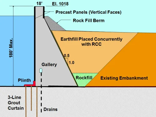 The condition of the dam was such that it warranted a major repair and/or reconstruction of the dam. From the options presented, the best option was to construct a new roller-compacted concrete (RCC) dam that would be able to restore the reservoir to its original operating level. The new RCC structure was completed in 1998. The RCC dam required approximately 380,000 cubic yards of roller-compacted concrete to build, making it the third largest RCC dam in the U.S at the time.