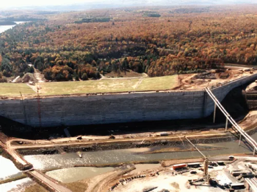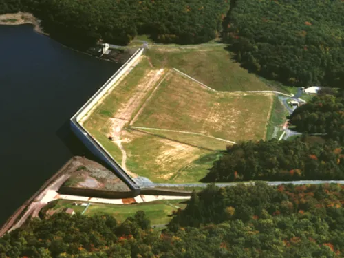 Penn Forest Dam was constructed between 1956 and 1958 to be one of the main water supply reservoirs for the city of Bethlehem, Pennsylvania. The dam was originally an earthfill embankment structure, standing 145 feet high, 1,930 feet long, and storing 6.4 billion gallons of water.