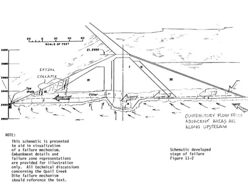 On the morning of December 31, 1988, cloudy seepage was observed at the downstream toe near station 5+90 near an observation well. Seepage flows were estimated at 200-300 gpm. Over the course of the day, equipment operators placed gravel over the ever-increasing area in an attempt to control seepage. Inspectors watched at the upstream edge for whirlpools, vortices, and other signs of seepage entrances to the foundation, but none were identified. As night fell a light plant was brought to the site and set up on the dike crest focusing illumination on the downstream toe. By 10:30 PM, the seepage flow rate had reached 70 cfs and the flow direction had changed from vertical to horizontal with a growing hole at the downstream toe. Unable to control the flow, personnel and equipment were moved to safe locations and a downstream evacuation was ordered. Between 11:00 and 11:30 PM, a wedge 50 feet wide and 25 feet high suddenly dropped several feet, blocking flow temporarily until flow resumed and began removing the collapsed material. Erosion continued toward the reservoir until at 12:30 AM on January 1, 1989, Quail Creek Dike failed, releasing an estimated 25,000 acre-feet of water into the Virgin River and downstream flood plain; the result of a breach 300 feet wide and some 80 to 90 feet deep.