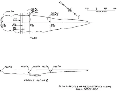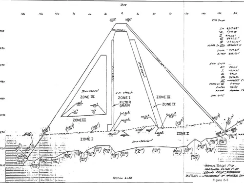 The Quail Creek Dike was designed as a 1,980 foot long, 78 foot high zoned earthfill structure. The cross section would consist of a centrally located Zone I, low permeability, core with a 10 foot thick, low permeability Zone II liner along the upstream face of the Zone I core. Downstream of the core was a 4 foot thick vertical sand filter. The upstream shell was a Zone III, pit run material and the downstream shell consisted of a Zone IV, random fill surrounded by Zone III material. Eighteen inches of basalt riprap served as upstream erosion protection. Six piezometers were installed on the dike, extending into the embankment and foundation.